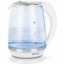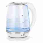 Чайник ECG RK 2020 White Glass — интересный, современный дизайн, гораздо быстрее греющий воду и очень экономичный. Объем электрочайника составляет 2 литра, при мощности 2200 Вт позволяет нагревать воду всего за пару минут. Для определения уровня воды в чайнике имеется специальный индикатор уровня воды.